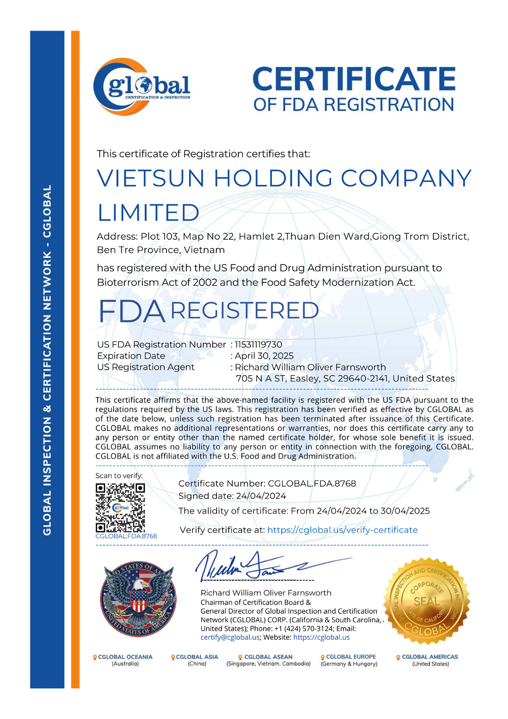 شهادة تسجيل FDA – Certificate of FDA Registration